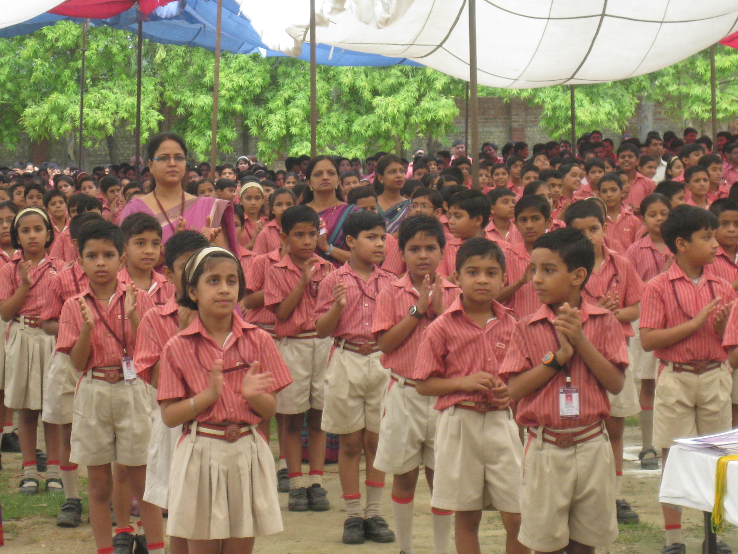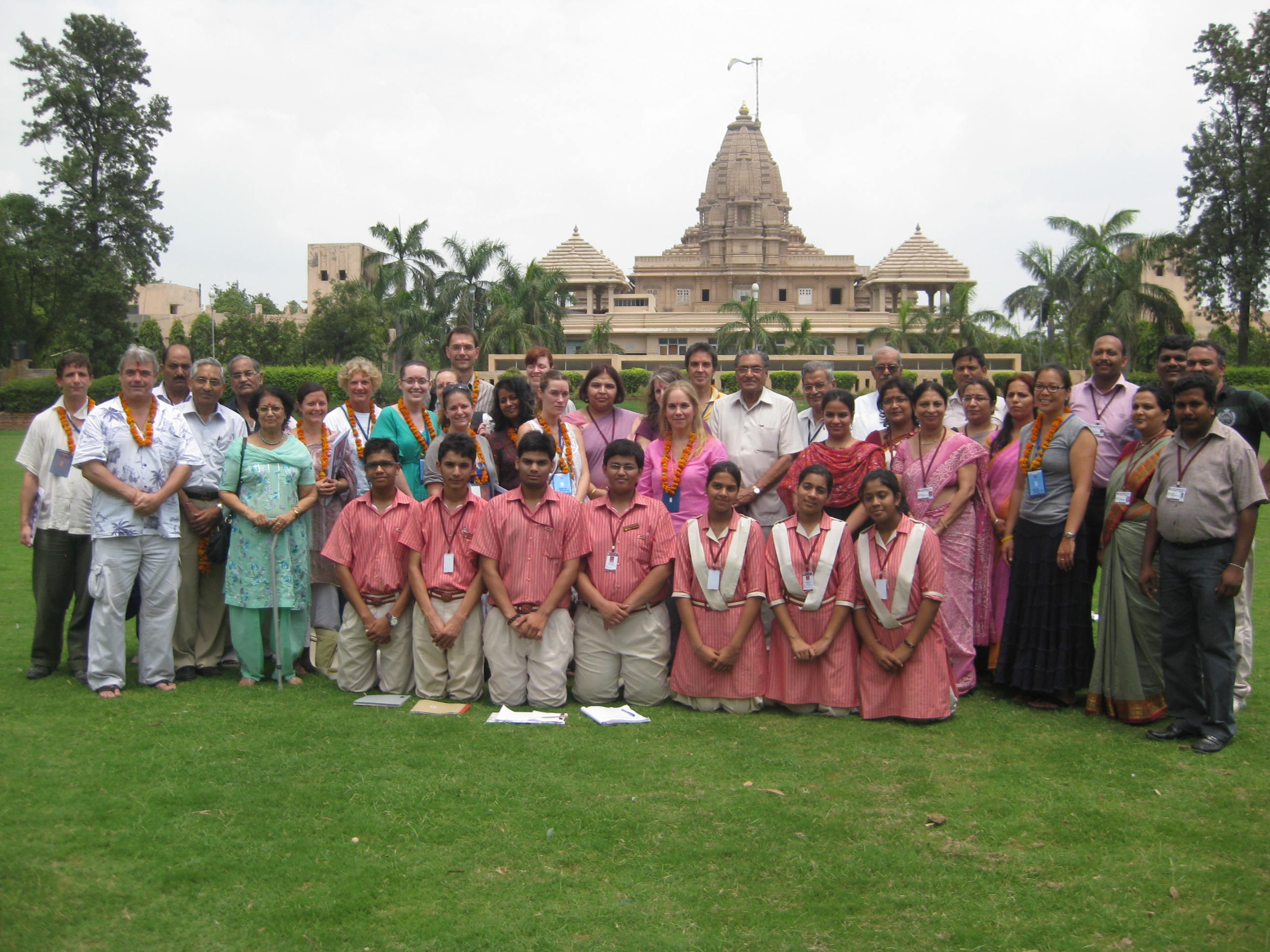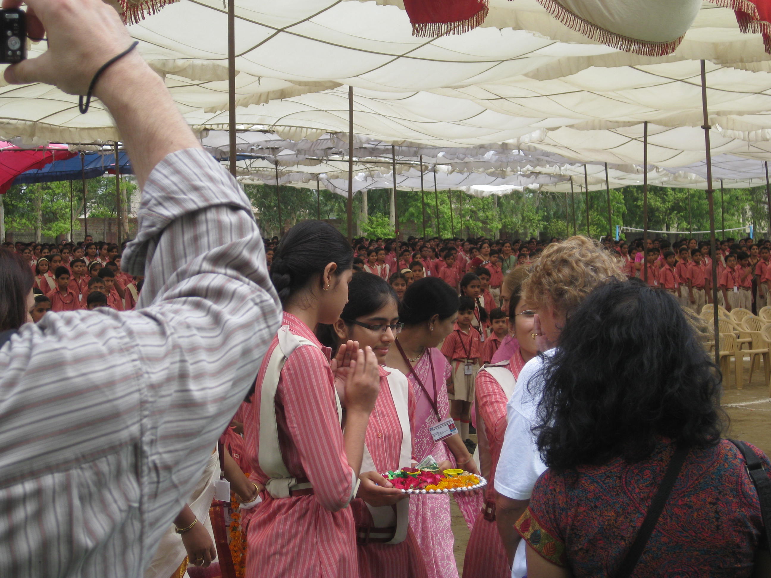 On Tuesday (July 10), we had the opportunity to visit the school that is on the Smarak campus.  What a welcome we received! We entered into the courtyard along a pathway lined with students greeting us.  We each received a bindi mark on our foreheads and a marigold garland on the way to our seats.  We were guests at their school-wide assembly, which is how they start school everyday.  1800+ students gather together for mediation, the national anthem, shakras, daily news, and skits.  Afterwards, we got an extensive tour of their medicinal garden, which grows over 40 plants and is maintained by the students and staff.  Here are some photos from the morning visit: ImageImageImageImageImage